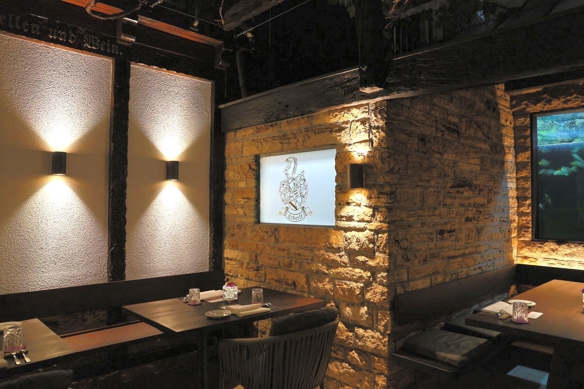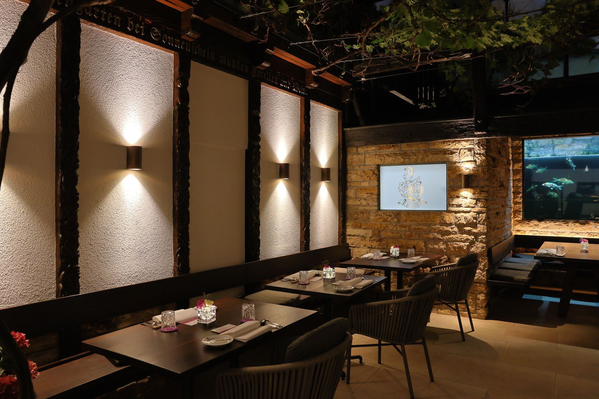 Nestled behind the Restaurant Zur Weinsteige Stuttgart, our romantic Vineyard Terrace with 25 seats is a wonderful place to spend a few leisurely hours on a lovely summer’s day. It is here that you can enjoy our fine dining menu surrounded by grape vines. The walls, made of local travertine stone from Cannstatt, radiate the day’s warmth late into the evening and the sight of the fish lazily swimming circles in the large aquarium allow the chaos of the city to fade away.