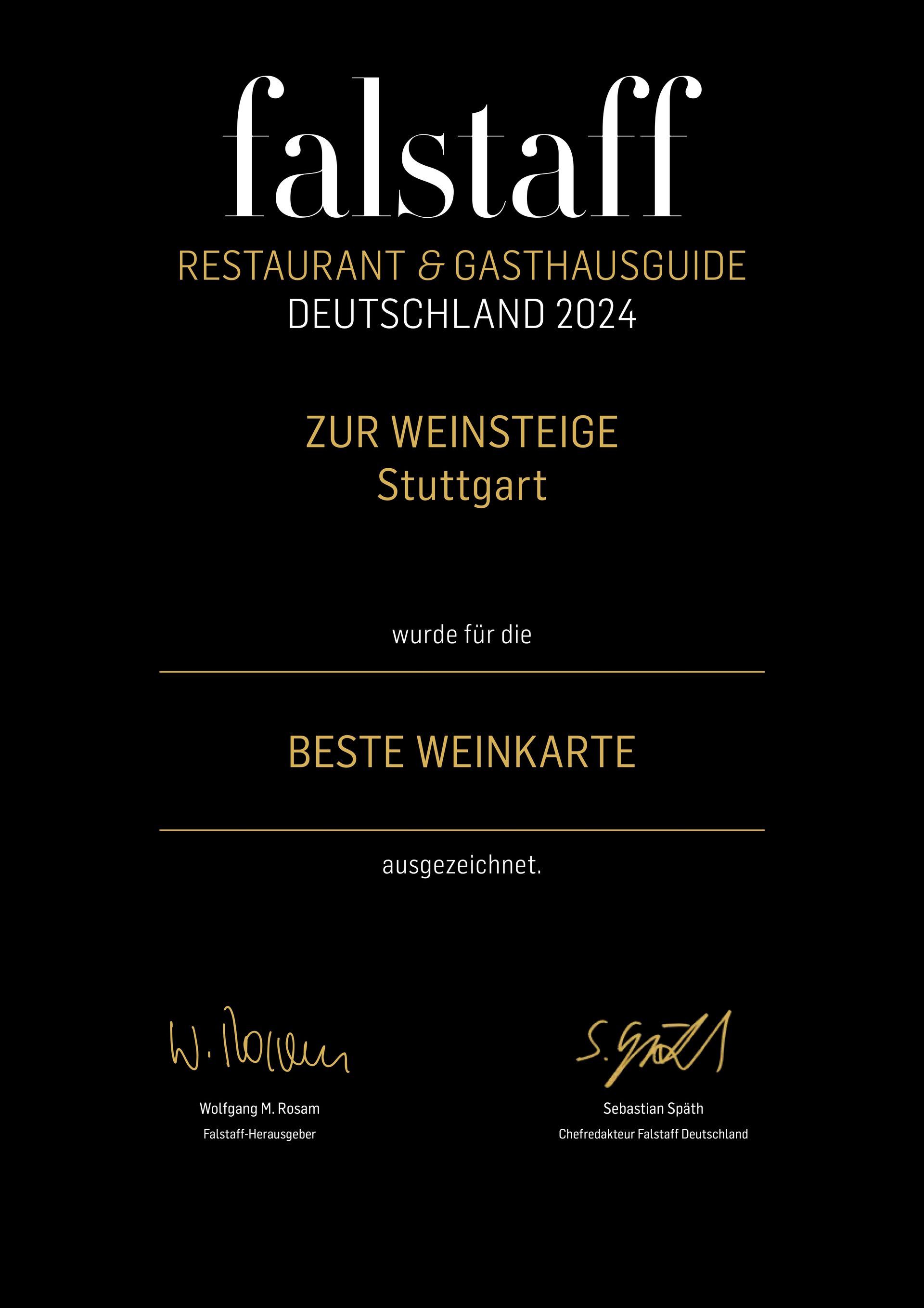 So er hat das Restaurant im März 2024 den ersten Michelin Stern erhalten aber auch in allen namhaften Restaurantführern, wie zB dem Gusto und dem Gault Millau, exzellente Bewertungen und rangiert seit über zwanzig Jahren in den Top Ten der Landeshauptstadt Stuttgart. Aktuell belegt das Restaurant Zur Weinsteige den 4.Platz der besten Restaurants in Stuttgart.